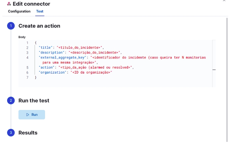 After filling in the payload body, click Run to perform a test. If everything is configured correctly, you will receive an incident notification in the Elven Platform. This process is essential to ensure that ElasticSearch alerts are efficiently integrated with the Elven Platform, enabling centralized and agile incident management. Once configured, the service will appear in the External Services Monitoring Center, sorted by status, making it easier to monitor incidents with priority given to those in an alarmed state.