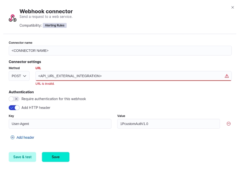 For this configuration, authentication is not required, so you can uncheck that option. However, remember to add an HTTP header to ensure the integration works correctly. To do this, select the ADD HTTP HEADER option and fill in the fields with the following values: