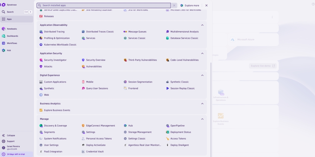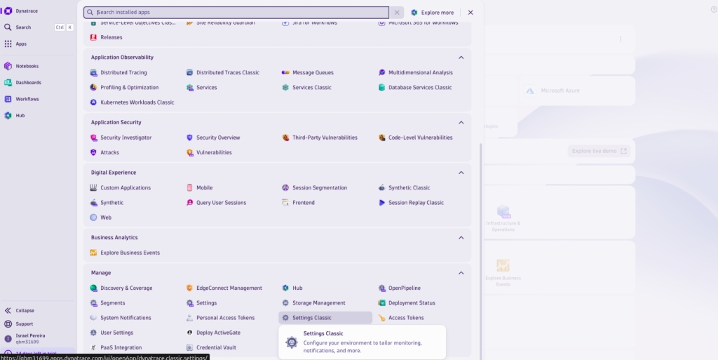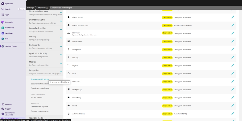 To configure a webhook in Dynatrace and integrate it with the Elven Platform, the process is simple and straightforward. Start by accessing the left side panel in Dynatrace, navigating to Apps > Manage > Settings Classic. There, go to the Integration section and choose the Problem Notification option.