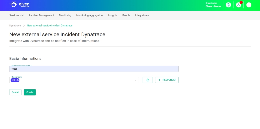 The External Services Center of Elven Platform is the bridge that connects you to the best tools on the market to monitor, manage, and resolve incidents in a simple and efficient way. In it, you can integrate Dynatrace with Elven Platform, allowing the reception of notifications and events related to incidents directly on the platform. This enables you to monitor and analyze your applications and services from the perspective of Incident Management, using the best practices and methodologies in the market, all in one place.
