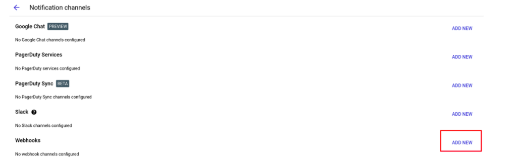 Scroll down the screen until you find the Webhooks section and click Add New. This will open a form to configure the new notification channel.