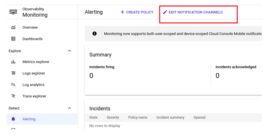 In the center of the screen, look for the Edit Notification Channels button and click it. This section is where you can add, edit, or remove the notification channels that Google Cloud uses to alert you about incidents.
