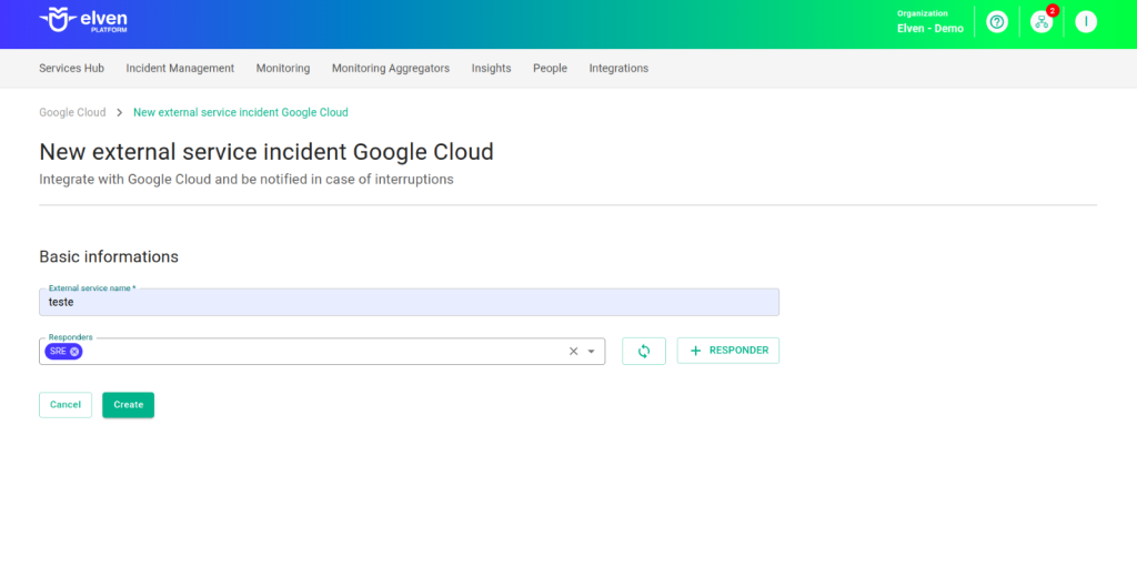 The External Services Center of the Elven Platform is the bridge that connects you to the best tools on the market to monitor, manage, and resolve incidents in a simple and efficient way. Within it, you can integrate Google Cloud Monitoring with the Elven Platform, allowing incident and event notifications related to incidents to be received directly on the platform. This enables you to monitor and analyze your applications and services from the perspective of Incident Management, using the best practices and methodologies available, all in one place.