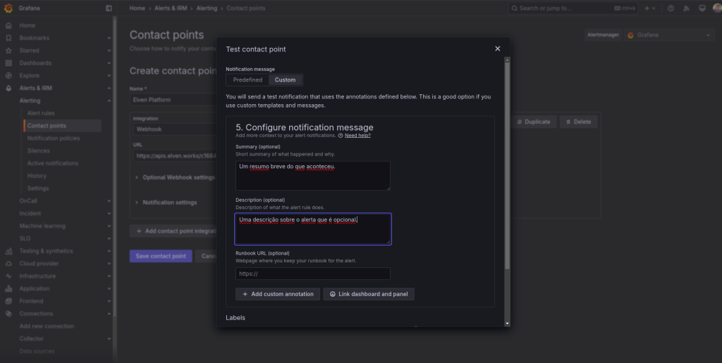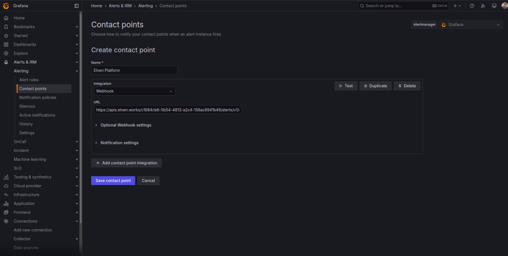 Connecting Grafana to the Elven Platform is a simple and intuitive process, especially with dedicated support for Grafana versions 8 and 10. To begin, access the left menu in Grafana and click on Contact Point, where you'll find the option Add Contact Point. In the form, define a name for the contact point, such as “Elven Platform”, to make it easier to identify within the platform. Choose the Webhook integration type, which allows real-time incident notifications to be sent. In the URL field, enter the URL generated in the Elven Platform, making sure to select the URL corresponding to the Grafana version you are using, either 8 or 10. This compatibility ensures the tools integrate seamlessly, maintaining a consistent notification flow.