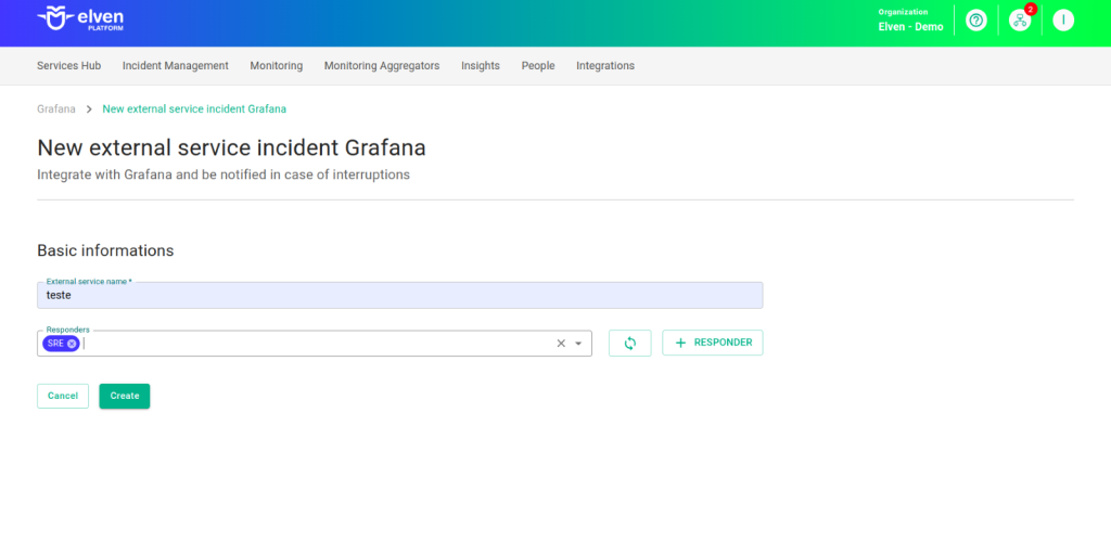 The External Services Center of the Elven Platform is the bridge that connects you to the best tools on the market to monitor, manage, and resolve incidents in a simple and efficient way. Through it, you can integrate Grafana with the Elven Platform, enabling the receipt of incident notifications and incident-related events directly within the platform. This allows you to monitor and analyze your applications and services from the perspective of Incident Management, using the best practices and methodologies available, all in one place.