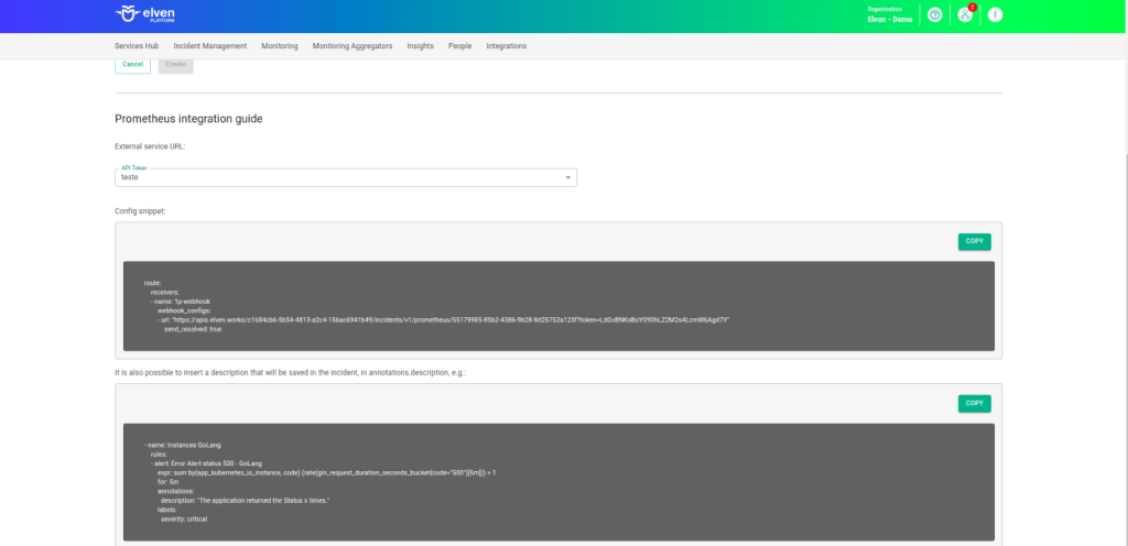 Integrating Prometheus with the Elven Platform is a simple and straightforward process, designed to provide an efficient and intuitive incident management experience. Below, we detail the steps to configure the webhook, routes, and alerts in Prometheus, enabling seamless integration with the Elven Platform.