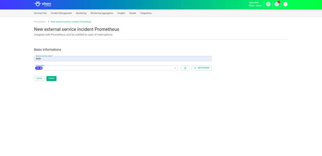 The External Services Center of the Elven Platform is the bridge that connects you to the best tools on the market to monitor, manage, and resolve incidents in a simple and efficient way. Through it, you can integrate Prometheus with the Elven Platform, allowing the reception of alerts and events related to incidents directly on the platform. This enables you to monitor and analyze your applications and services from the perspective of Incident Management, using the best practices and methodologies available, all in one place.
