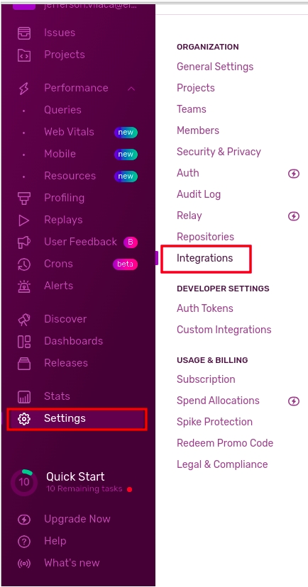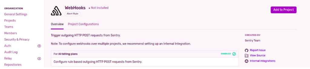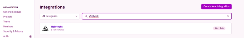 It all starts by accessing the Sentry dashboard. Click on Settings and then on Integrations. In this area, you’ll find all available integration options. To make it easier, type “Webhook” in the search bar to quickly locate the integration we’re going to configure.