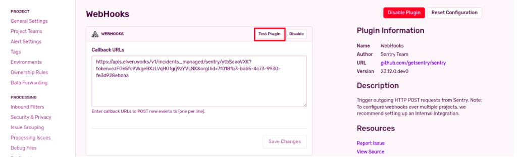 Now, it's time to test! Sentry offers the Test Plugin feature, which simulates sending an alert to verify if the communication is working correctly. When everything is properly configured, you will see an incident automatically created on the Elven Platform. This confirms that the integration was successful and that the alerts are being transmitted as expected.