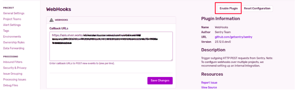 With the Webhook integration selected, click on Add Project and select your project. If you don’t have one configured yet, you’ll need to do that first. Enter the URL that was generated when you configured the External Service Sentry on the Elven Platform. This URL is essential to establish the connection between the two platforms. After filling in the Callback URLs field, remember to click Save Changes to ensure the changes are applied. After that, activate the integration by clicking Enable Plugin.