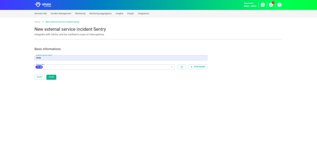 In the form, start by filling in the External Service Name field, which will be the name of the external service, and define the Responders, that is, the people or teams who will receive notifications related to this service. After that, click CREATE to proceed. This action will create the initial record of your external service.