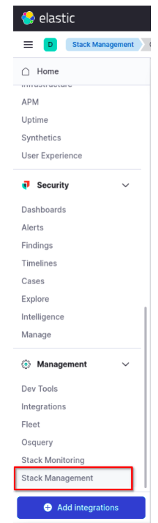 Alerts and Insights: A specific area within Stack Management dedicated to configuring alerts, connectors, and data-based insights.