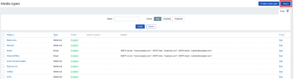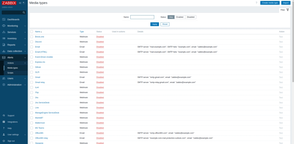 During the import, it is essential to check the Create new option, ensuring that the Media Type is added correctly without overwriting any other configuration. Once the import is complete, the Elven Platform will appear in the list of available Media Types. This will be the channel through which Zabbix will send alerts to the Elven Platform.