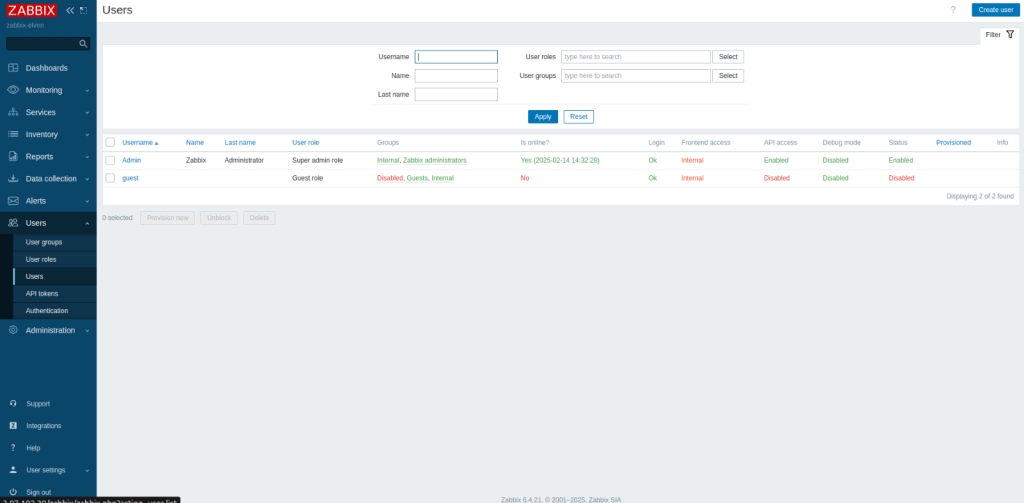 Now that the notification rule has been created, we need to ensure that the user configured in Zabbix receives the alerts correctly. Access the Zabbix side menu, click on Users, and then Users again. From the list of users, select Admin. Next, go to the Media tab and click Add to add a new notification channel. On the configuration screen, choose Elven Platform as the Type, and in the Send to field, enter a reference name, such as Elven Platform. It’s worth noting that, in the case of a Webhook, this reference is for organizational purposes only, since the actual service URL has already been defined in the Media Type. After filling everything out correctly, click Update to save the changes.