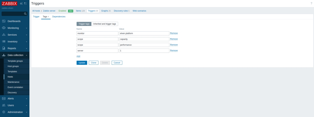 With this in mind, in Zabbix, we can add custom tags to triggers to strategically organize and categorize alerts. Simply go to the Hosts section, navigate to Triggers, and select the Tags tab. This makes alert triage easier, improves integration with the Elven Platform, and enables a faster response to incidents. With this approach, monitoring becomes more efficient and incident management much more agile and organized.