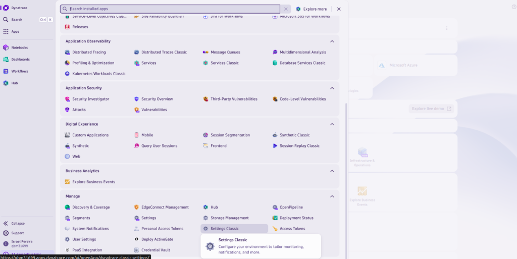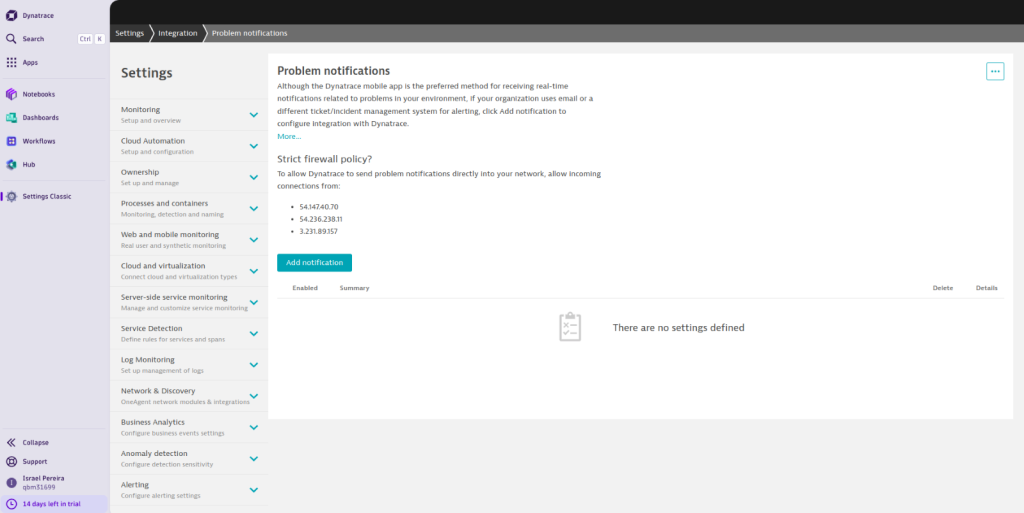To configure a webhook in Dynatrace and integrate it with Elven Platform, the process is simple and straightforward. Start by accessing the left side panel in Dynatrace, navigating to Apps > Manage > Settings Classic. There, go to the Integration section and select the Problem Notification option.