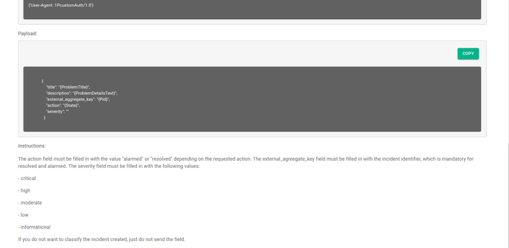 Remember to enable the option Call Webhook if problem is Closed, ensuring you are notified both when problems are opened and closed. Also, add an HTTP header by setting the name as User-Agent and the value as 1PCustomAuth/1.0.