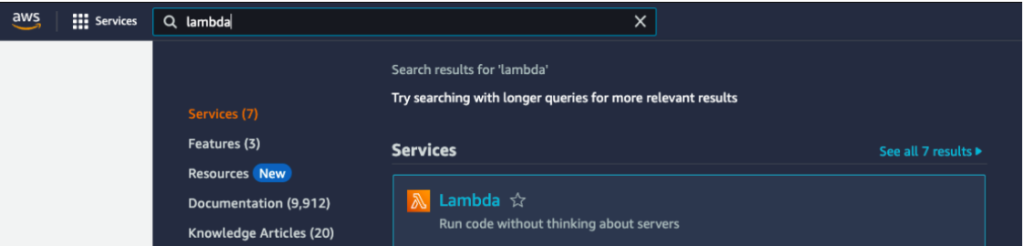 In AWS, you need to create a Lambda. In the services menu, search for Lambda, then click Create function: