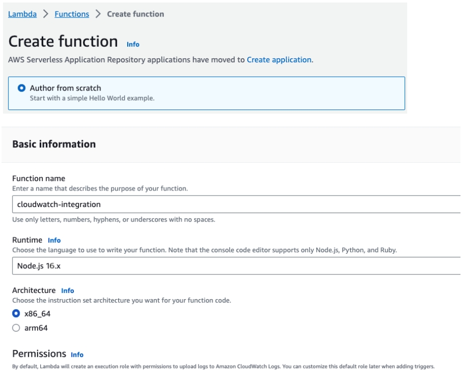 When creating the Lambda, you need to provide the name and the Runtime. By default, the one used is Node.js 20.x. After filling in the fields above, click Create function.