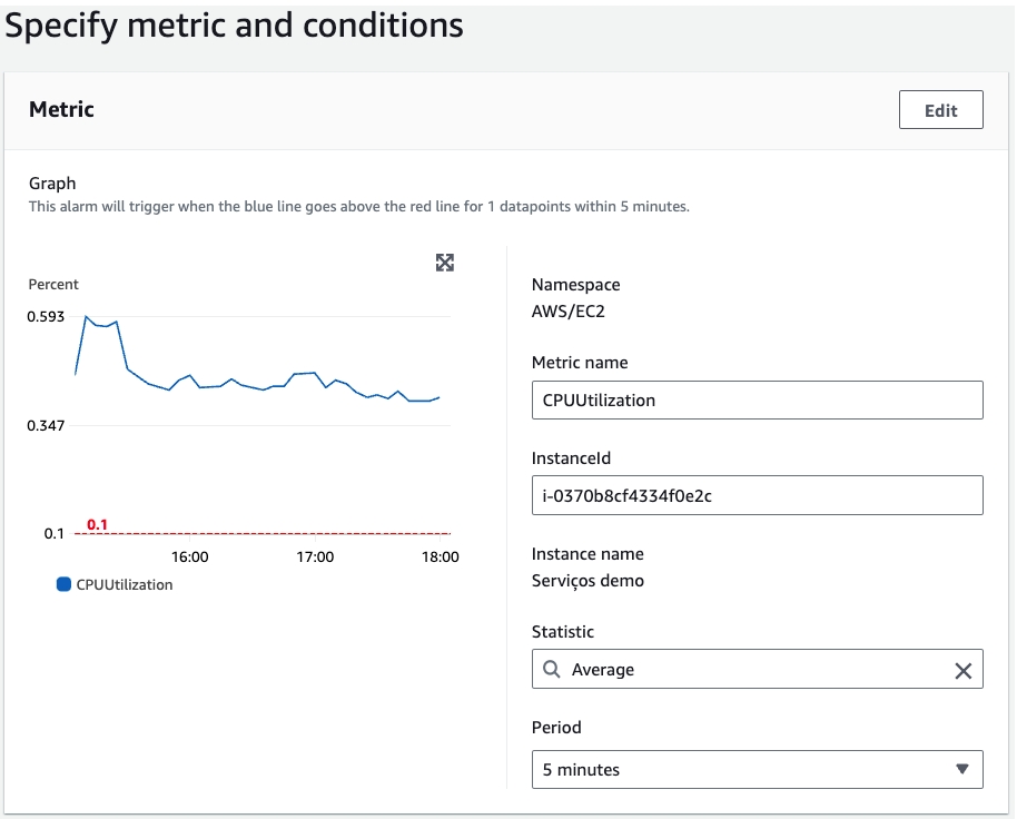 When accessing the CloudWatch service, the next step is to create the alarm by clicking Create alarm. Select the metric you want to monitor, in the example below, we are monitoring the CPU Utilization metric.