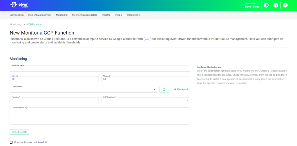 Select where the **monitoring agent** is located (**Checkpoint Cloud**) by choosing the appropriate **Environment**. If it doesn’t exist, you can create one using **+ Checkpoint**. Next, enter the **Function**, which corresponds to the name of the function you want to monitor. This name is essential to identify the specific function within your **GCP environment**. After that, you’ll need to configure the **GCP Location**, which specifies the region where your function is hosted. This helps the **Elven Platform** connect properly to the **GCP service**.