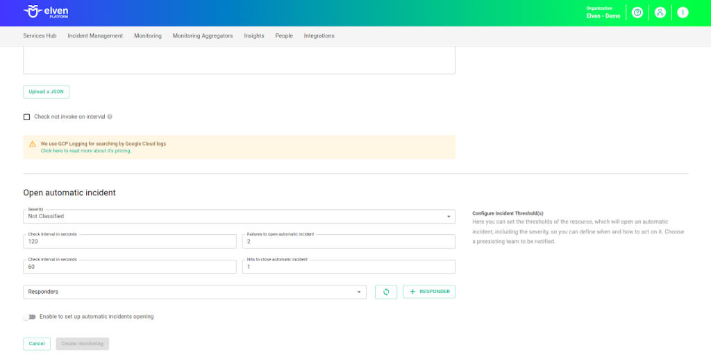 The **GCP Function Monitor** from **Elven Platform** enables checks based on **key queries** within **functions**. This feature helps configure **continuous checks**, set up **alerts**, and define **thresholds** for **automatic incident opening**, ensuring you are quickly informed about any **irregularities** in **connectivity** or **service performance**.