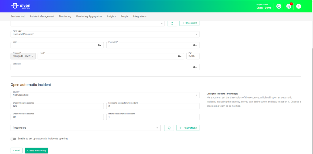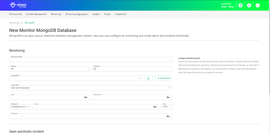 The MongoDB Monitor from the Elven Platform enables checks based on key queries in MongoDB. This feature helps you configure continuous checks, set alerts, and define thresholds for automatic incident opening, ensuring you're quickly informed of any irregularities in connectivity or service performance.