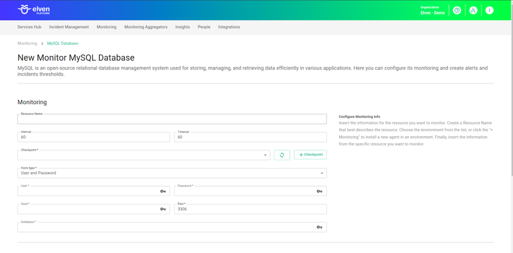 Select where the **monitoring agent** is located (**Checkpoint Cloud**) by choosing the **Environment**. If it doesn’t exist, you can create one using **+ Checkpoint**. After this configuration, in **Form Type**, you can choose between **User and Password** or **Healthcheck URL**. In **User and Password**, you must provide the **Username** and **Password**, which are the **database access credentials**. Next, enter the **server address** in the **Host** field and the **Port**, which by default is **3306**, but can be adjusted if the database is configured on a different port.