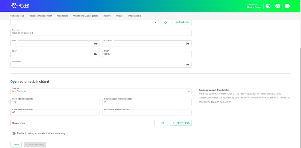 You can configure **automatic incident opening** to ensure a quick response to critical issues. To begin, define the **incident severity**, allowing you to prioritize according to urgency. Next, adjust the **Check Interval**, specifying the check frequency in seconds to continuously monitor the resource. This helps ensure you're always one step ahead, detecting problems as soon as they arise.