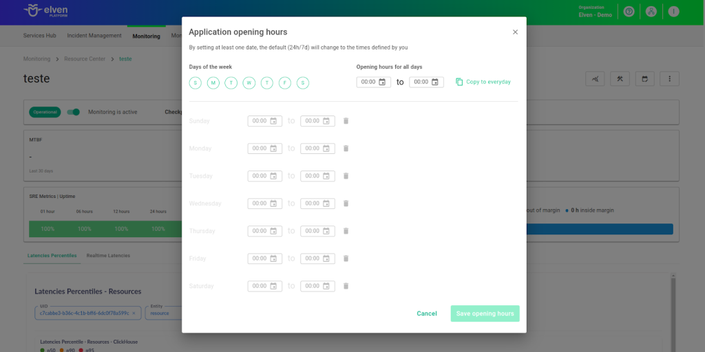 For example, imagine your application operates only from **Monday to Friday**, between **9:00 AM and 6:00 PM**. You can configure **Application Opening Hours** to reflect this schedule by specifying the **working days and hours**. With this setup, the **Elven Platform** automatically disables checks outside of these hours, preventing the logging of failures that don’t affect end users and avoiding unnecessary alerts. This approach optimizes **performance analysis**, focusing only on relevant periods and providing a clearer view of your application’s **health** during its **operating hours**.