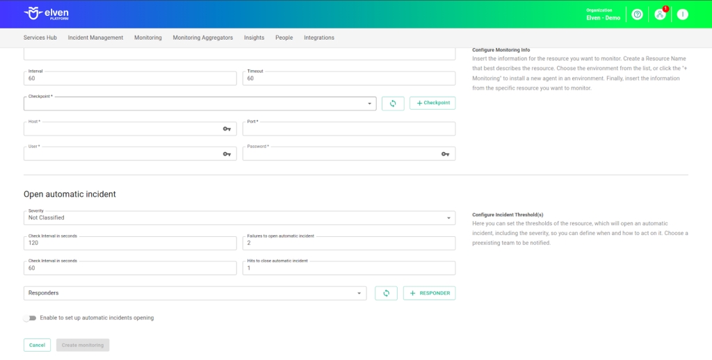 You can configure automatic incident opening to ensure a quick response to critical issues. To begin, define the incident severity, allowing you to prioritize according to urgency. Next, adjust the Check Interval, specifying the check frequency in seconds to continuously monitor the resource. This helps ensure you're always one step ahead, detecting problems as soon as they arise.