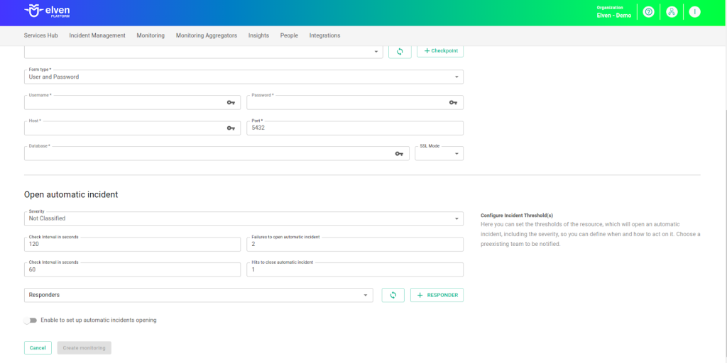 You can configure automatic incident opening to ensure a quick response to critical issues. To begin, define the incident severity, allowing you to prioritize according to urgency. Next, adjust the Check Interval, specifying the check frequency in seconds to continuously monitor the resource. This helps ensure you're always one step ahead, detecting problems as soon as they arise.