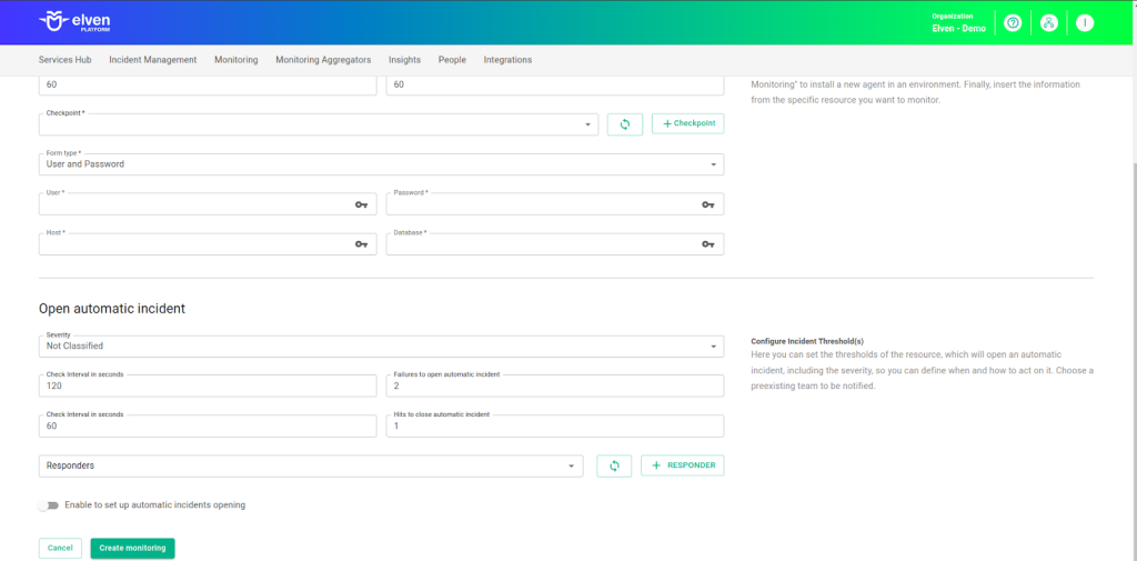 You can configure automatic incident opening to ensure a quick response to critical issues. To begin, define the incident severity, allowing you to prioritize according to urgency. Next, adjust the Check Interval, specifying the check frequency in seconds to continuously monitor the resource. This helps ensure you're always one step ahead, detecting problems as soon as they arise.