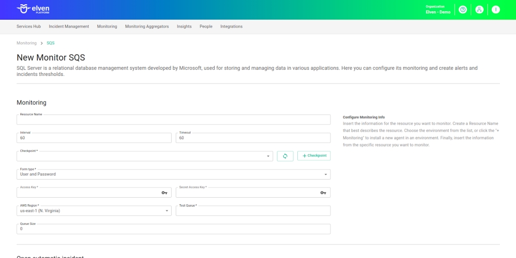 Monitoring your services has never been easier! To configure AWS SQS monitoring in the Elven Platform, start by assigning a clear name to the resource in the Resource Name field. Choose something that makes it easy to identify, especially in environments with multiple services being monitored.