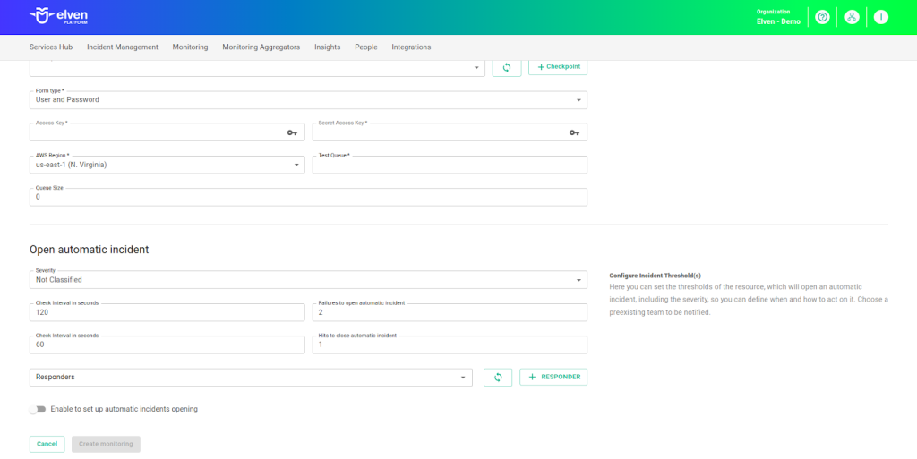 You can configure automatic incident opening to ensure a quick response to critical issues. To begin, define the incident severity, allowing you to prioritize according to urgency. Next, adjust the Check Interval, specifying the check frequency in seconds to continuously monitor the resource. This helps ensure you're always one step ahead, detecting problems as soon as they arise.