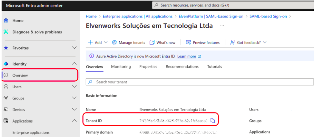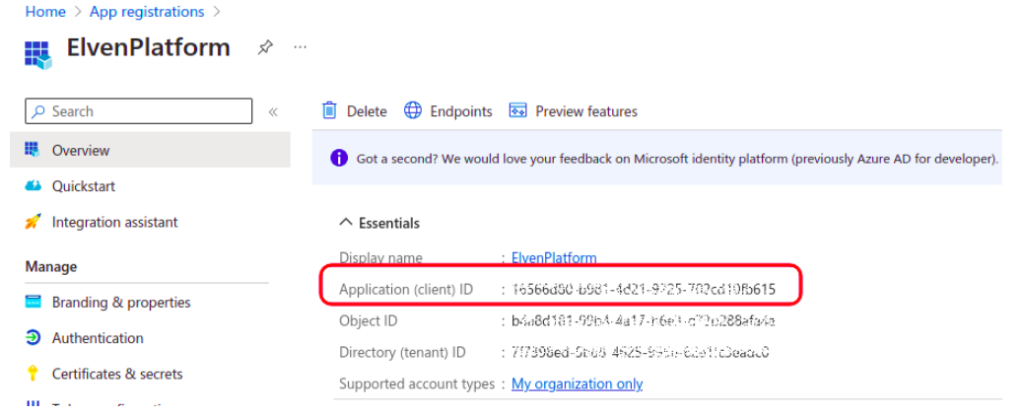 In Microsoft Entra, go to Identity > Overview and copy the Tenant ID. This unique identifier represents the configured workspace and should be pasted into the Your workspace tenant ID field in the Elven Platform. Then, go back to Microsoft Entra under Applications > App registrations > All applications, open your application, and copy the Application (client) ID, pasting it into the Client ID field in the Elven Platform.
