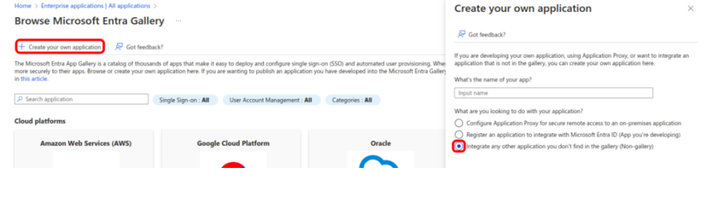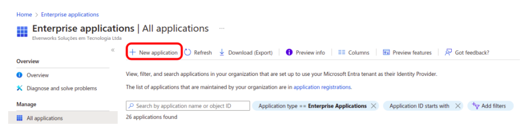 Start by accessing the Microsoft Entra Admin Center dashboard. In the side menu, go to Identity > Applications > Enterprise applications and click New application. Here, you will create a new custom application to integrate with the Elven Platform. Choose the option Create your own application and select “Integrate any other application you don’t find in the gallery (Non-gallery)”. This ensures that you can configure any application not previously listed in the catalog.