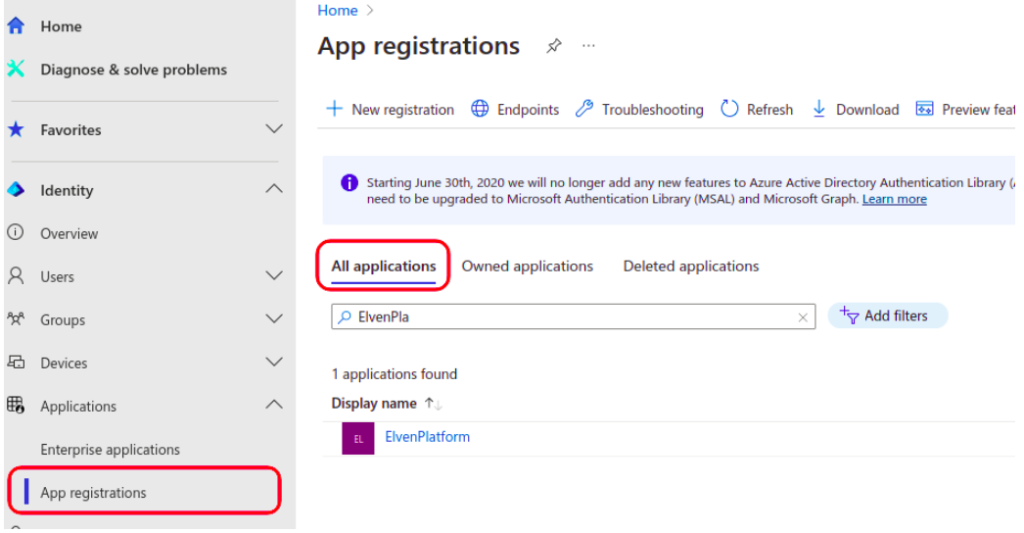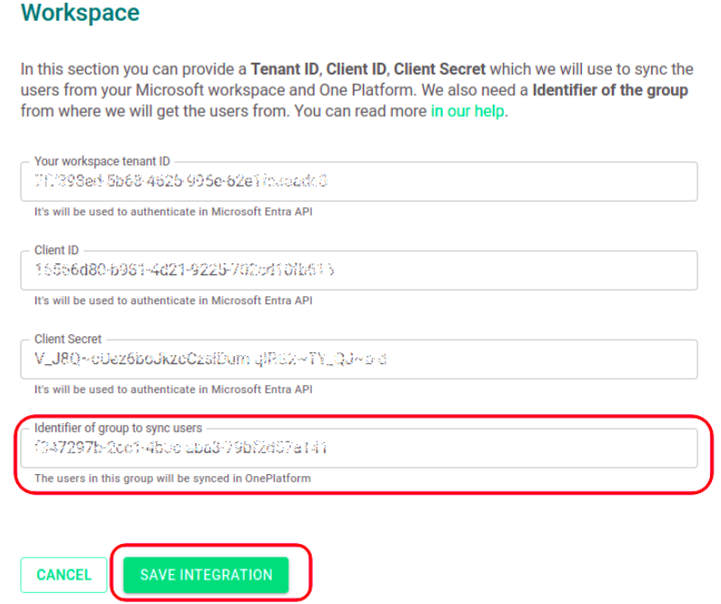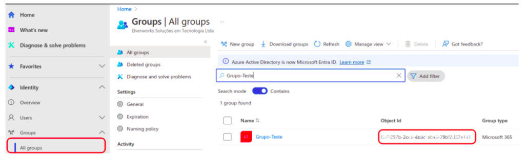 In Microsoft Entra, go to Groups > All groups and copy the Object ID of the group you want to integrate with the Elven Platform. Paste this ID into the Identifier of group to sync users field and click SAVE INTEGRATION. This will automatically add the users belonging to that group to the Elven Platform with the role “member”. If you need to adjust user permissions, the platform allows you to modify the role later.