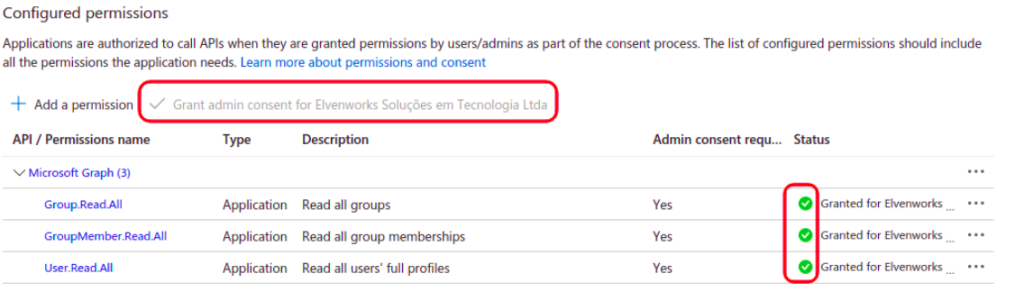 For the integration to work properly, you need to grant permissions to the application. In Microsoft Entra, go to API permissions > Add a permission, choose Microsoft Graph, and add the following permissions: User.Read.All, Group.Read.All, and GroupMember.Read.All. After that, click on Grant admin consent to activate these permissions.