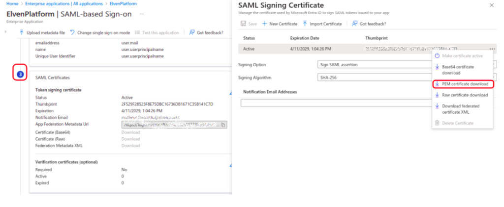 To ensure secure communication, you’ll need to configure a certificate. In Microsoft Entra, go to step 3 of the SAML configuration and click “edit”. Then, click the three dots and select PEM certificate download. After downloading the certificate, return to the Elven Platform and upload it by clicking SELECT FILE. This step authenticates the connection, ensuring that only trusted sources can interact.