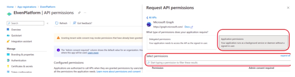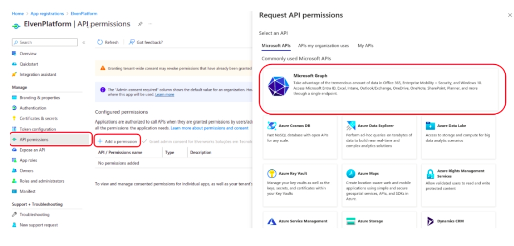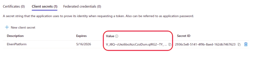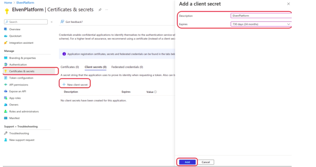 Then, go to Certificates & secrets > New client secret and fill in the fields with a description, such as “ElvenPlatform”, and a validity period of 24 months. Copy the Value generated and paste it into the Client Secret field in the Elven Platform. This secret is crucial for secure authentication between the platforms.