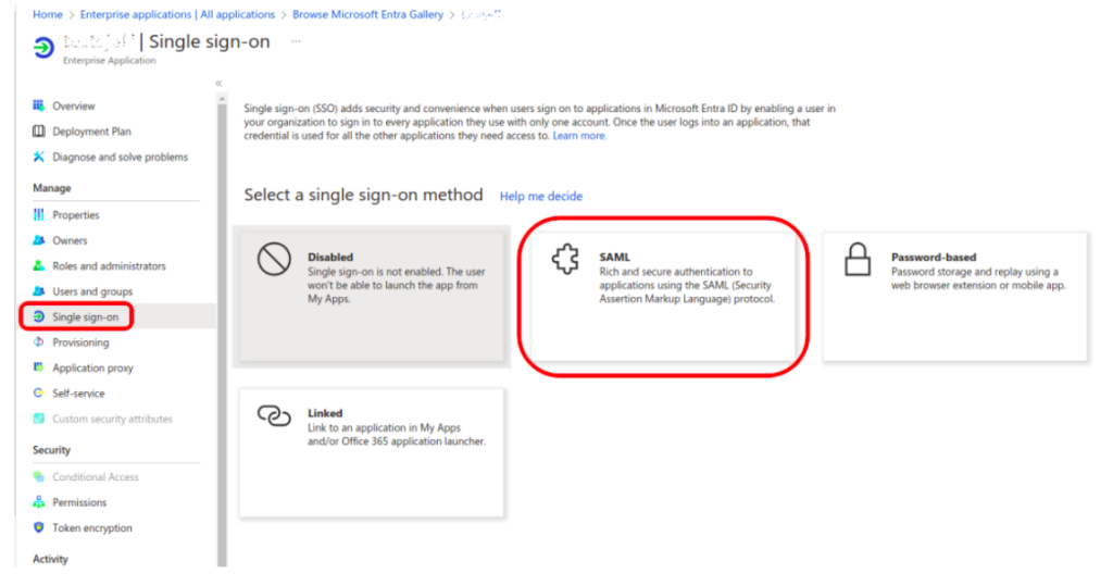After creating the application, go to its menu and select the Single sign-on tab, choosing the SAML method. In the Basic SAML Configuration field, you will need to fill in specific information from the Elven Platform. These settings are essential to establish communication between the systems.